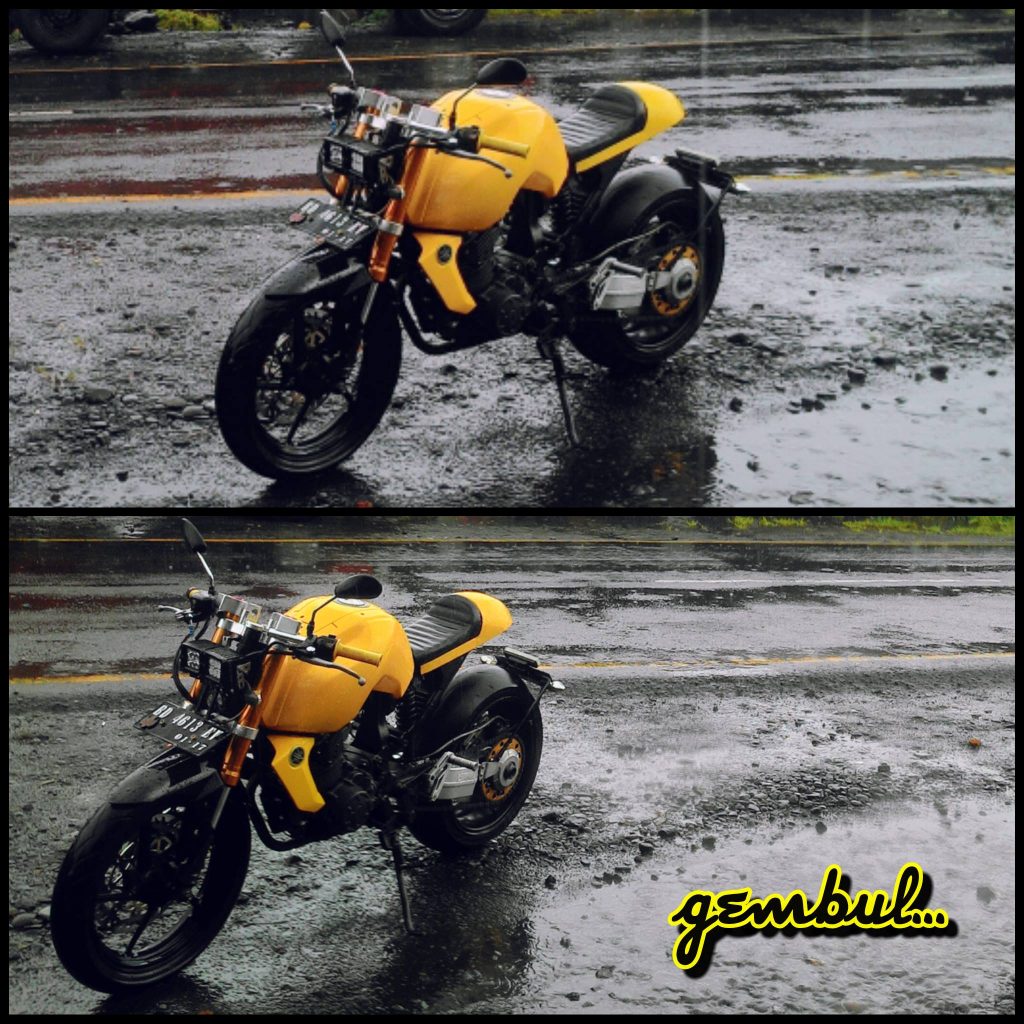 Tuh,intip sedikit modifikasi yang dilakukan oleh masbro Ritz Jr. Konsep yang diusungnya lebih ke Neo Cafe Racer,alias modifikasi ala Cafe Racer namun lebih ke gaya yang cenderung modern tuh brosist. Lihat saja,penggunaan velg gambot model Racing tersebut,bukan jari-jari seperti modifikasi cafe racer lainnya.. Yang lebih spesial lagi,bro Ritz berani mengubah warna sang Kebo dari biru cerah menjadi kuning cerah! Aduhhh kuningnya ini bikin jatuh hati deh! 😀