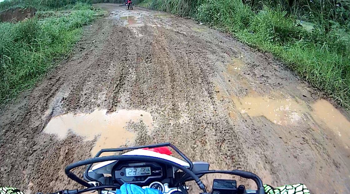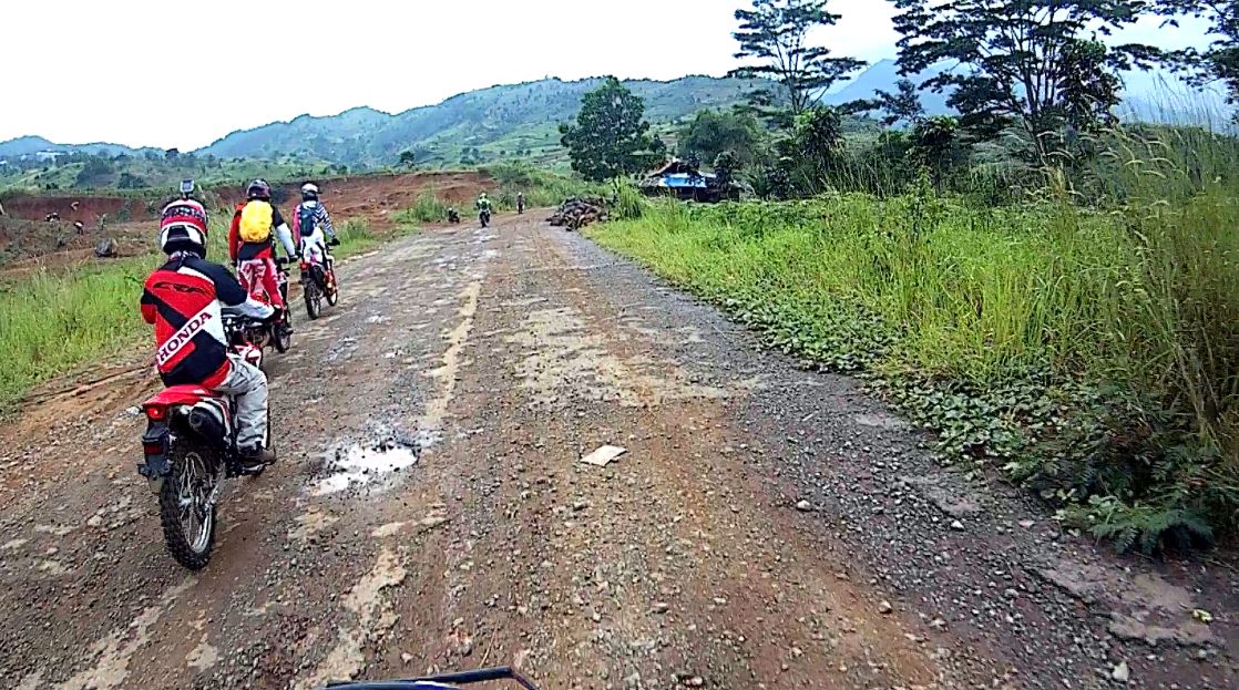 Awalnya sih masih biasa. Jalan tanah campur bebatuan tajam yang agak licin karena baru saja hujan. Jalur masuknya bisa ditebak, hampir semuanya jalur berbatu tanpa aspal hehe.. Disini saya bisa ngetes impresi awal dari suspensi Honda CRF150L yang bakal dibahas di artikel lain ya bro. Yang jelas, suspensinya niqmat dan gak bikin kecewa! Hal ini diamini sama temen-temen yang lain, mantap!