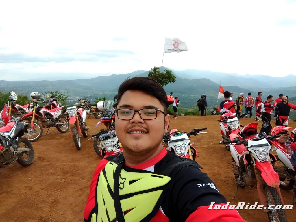Tanjakan pertama, clear. CRF150L saya masih mudah naiknya. Mulai tanjakan ke dua sudah dihalangi sama trek berbatu terjal dan tanah! Kemiringannya lebih-lebih dari yang sebelumnya. Saya nyoba naik dan ternyata bisa… sampe tengah doang XD. Karena ternyata ada yang abis jatoh juga di atas jadi saya terhalang. Stuck lah saya dan dibantu sama Opa buat naikin motornya ke atas, makasih opa.. Saya pun naik dengan keadaan lemas, sambil istirahat sejenak diatas..