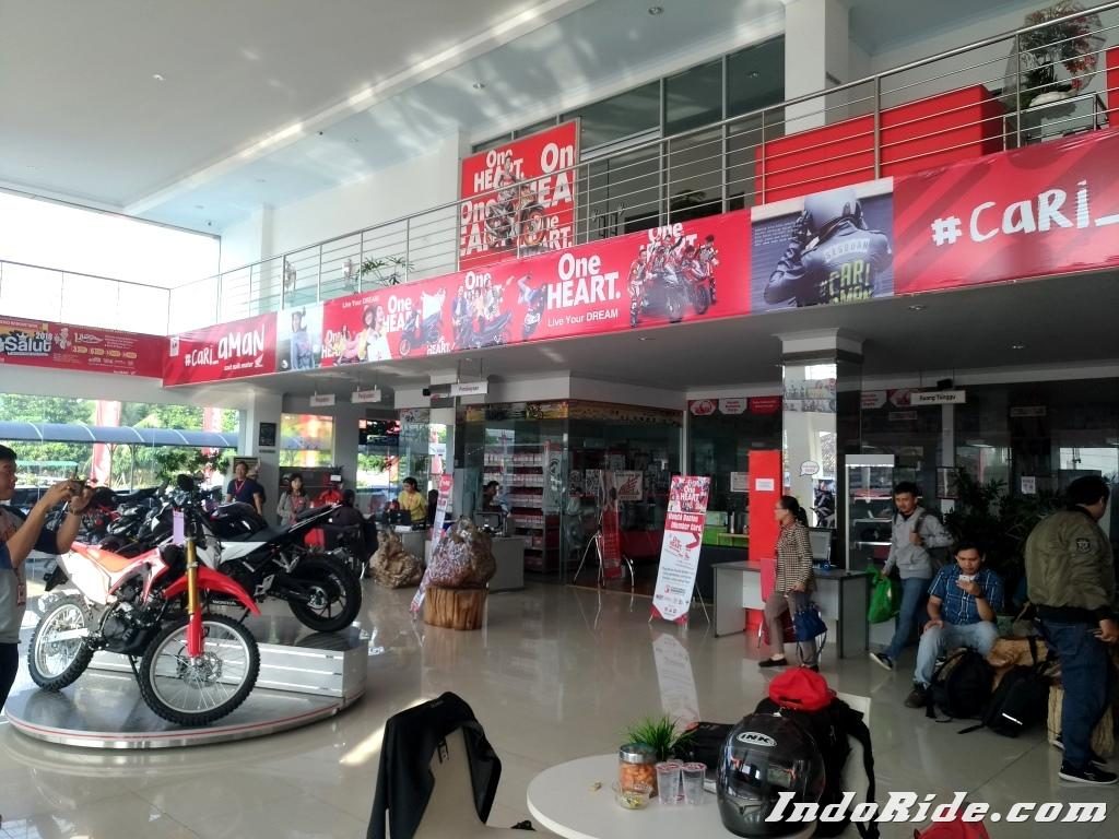 Touring hari pertama pun dimulai bro. Sejak jam 7 pagi kami sudah siap untuk ngegas motor. Gak lupa sarapan dulu di Hotel dan langsung OTW ke Main Dealer PT. MSK Serang. Perjalanan ke main dealer gak begitu jauh, hanya sekitar 10 menit. Sampai disana, kami disambut oleh dealer megah PT. Mitra Sendang Kemakmuran, yang penuh dengan hiasan batu akik! Usut punya usut, ternyata sang owner dealer memang pehobi batu akik bro, bahkan di pajangannya ada batu Panca warna yang beratnya lebih dari 100kg! Wuihh.. Gak lupa, sampe sana kami juga disambut sama pegawai main dealer MSK yang cantik-cantik hehe.. Ehh, maksudnya disambut sama motor motor yang udah siap kami geber! 🙂