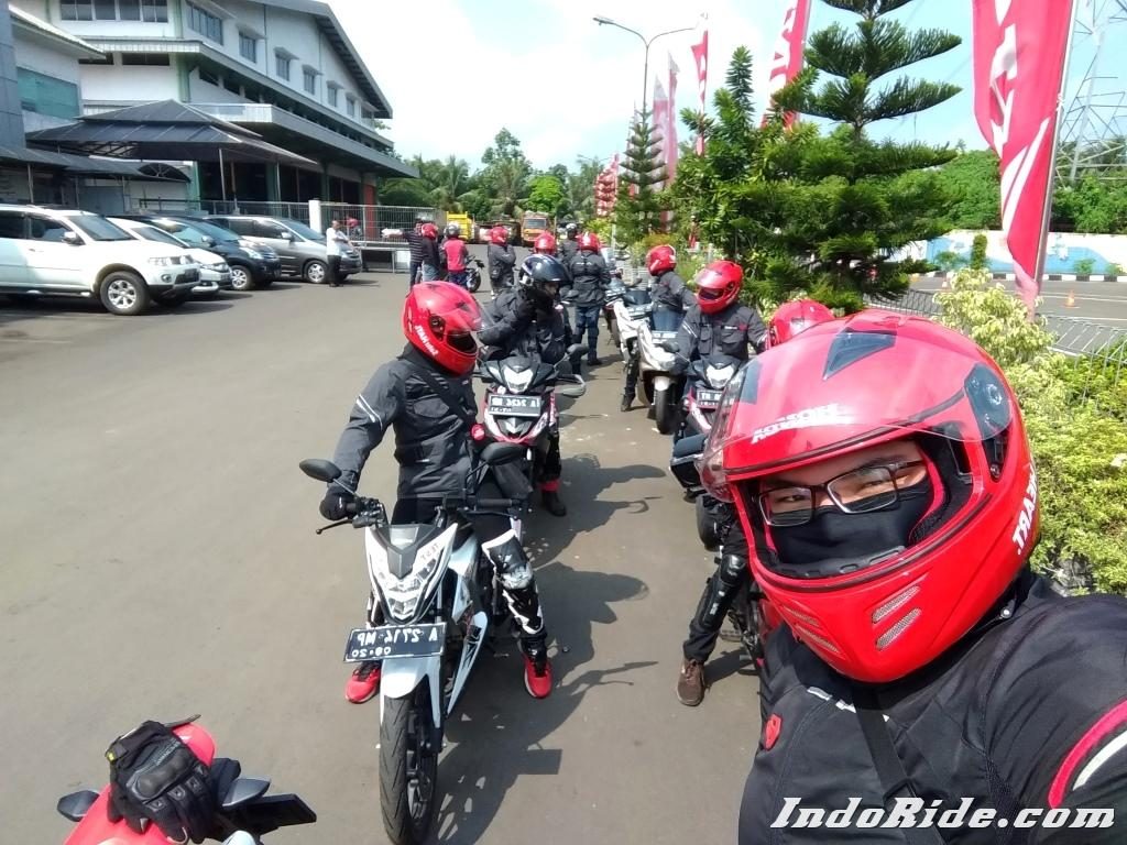 Tercatat di dalam list, admin IndoRide.com kebagian untuk geber lagi full Honda CRF150L! Yang menurut persepsi awal bakal cocok banget pake si ganteng garuk tanah ini di jalur arah Tanjung Lesung yang mayoritas bergelombang dan berlubang. Sedep deh. Yang lainnya juga ada Honda CRF250 Rally, CBR150R, CBR250RR, Sonic 150R, Supra GTR150, serta Honda PCX150 yang keren banget.. Perjalanan dimulai dengan briefing dan pengarahan dari PT. MSK, pihak polisi, serta temen temen Paguyuban Honda Banten yang dipimpin oleh kang Robert sebagai RC touring kali ini. Alhamdulillah dapet RC yang asik banget seperti kang Robert, jadi touring gak pernah lepas dari ketawa!