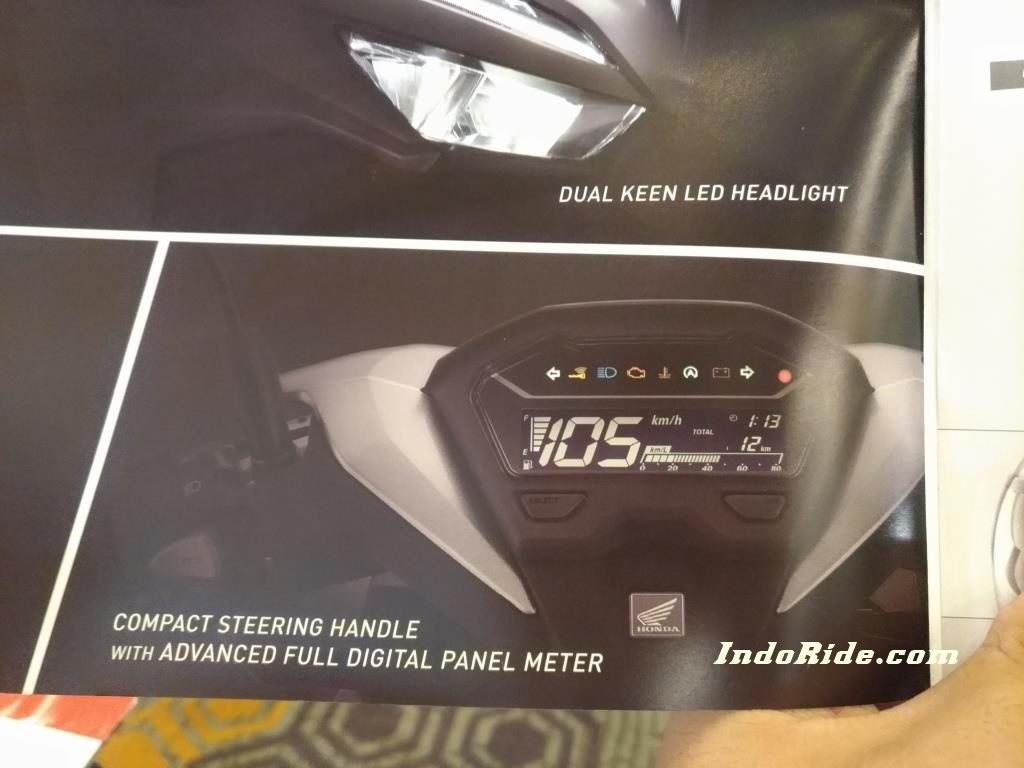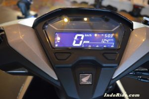 Fitur lain yang gak kalah menarik adalah speedometernya yang bisa dibilang cukup lengkap. Speedonya sudah negative backlit, dengan indikator lengkap. Mulai speedometer, fuel indicator, Trip A/B, MID Km/L, jam digital. dan yang paling mengesankan adalah ditambahkannya fitur voltmeter, untuk ngecek voltase aki! Gak ada cerita kena aki soak di jalan inih.. sedeep!