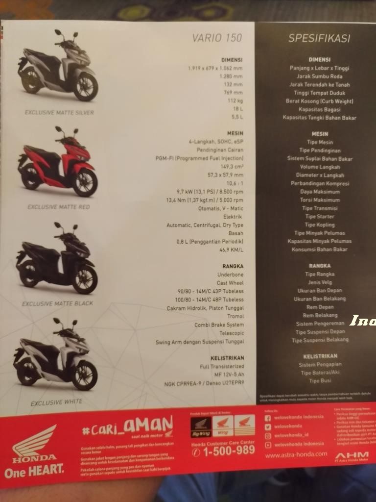 Ternyata masih ada lagi perubahannya, yakni dari velg dan ban! Velg berubah bentuk, jadi mirip velg Beat FI namun lebih kekar.. Praktis, ukuran ban dinaikkan satu step jadi 90/80-14 dan belakang 100/80-14, makin padet dan berasa handlingnya brosist.. Cakramnya juga sudah menganut tipe Wavy Disk sehingga lebih baik dalam menyebarkan panas hasil gesekan. Knalpot? Ini yang paling sangar, ngambil Knalpotnya CB150R dan CBR150R! Wuidihh.. Kok jadi ala ala sport ini vario. Wkwkwk… Okeh, kita lanjut bahas Pilihan Warnanya!