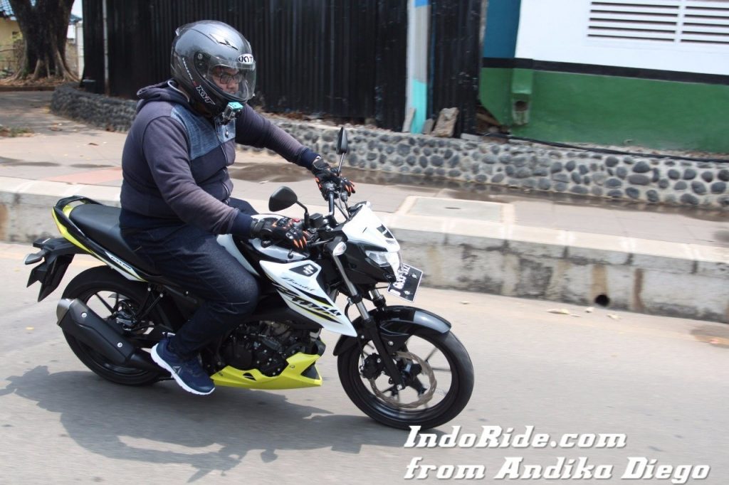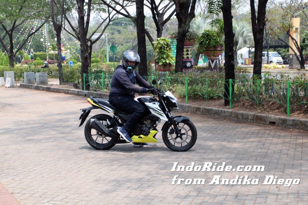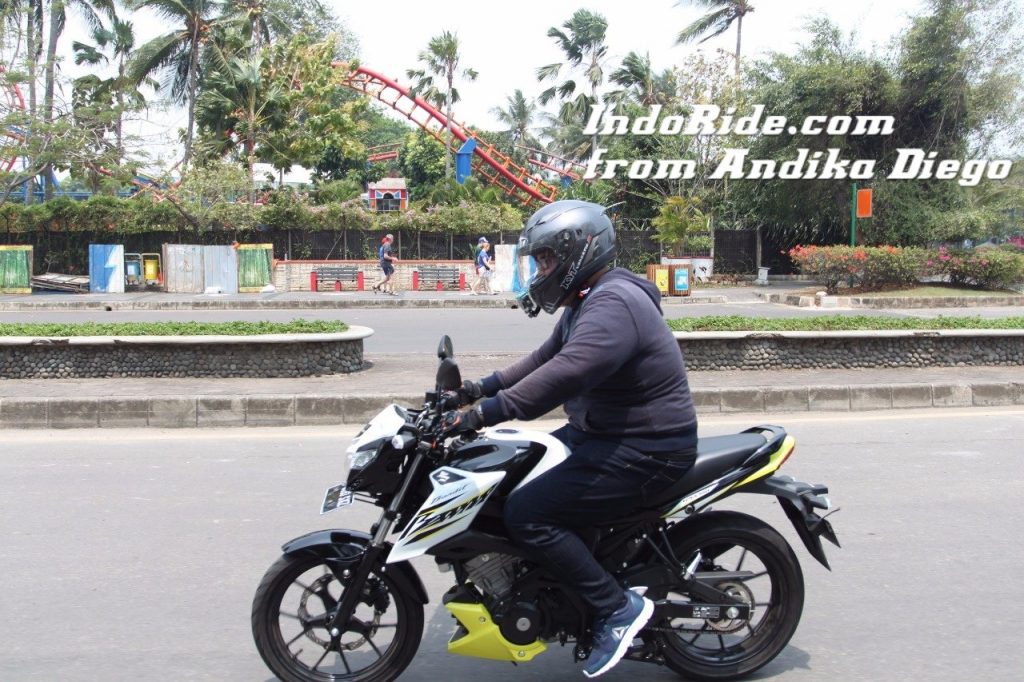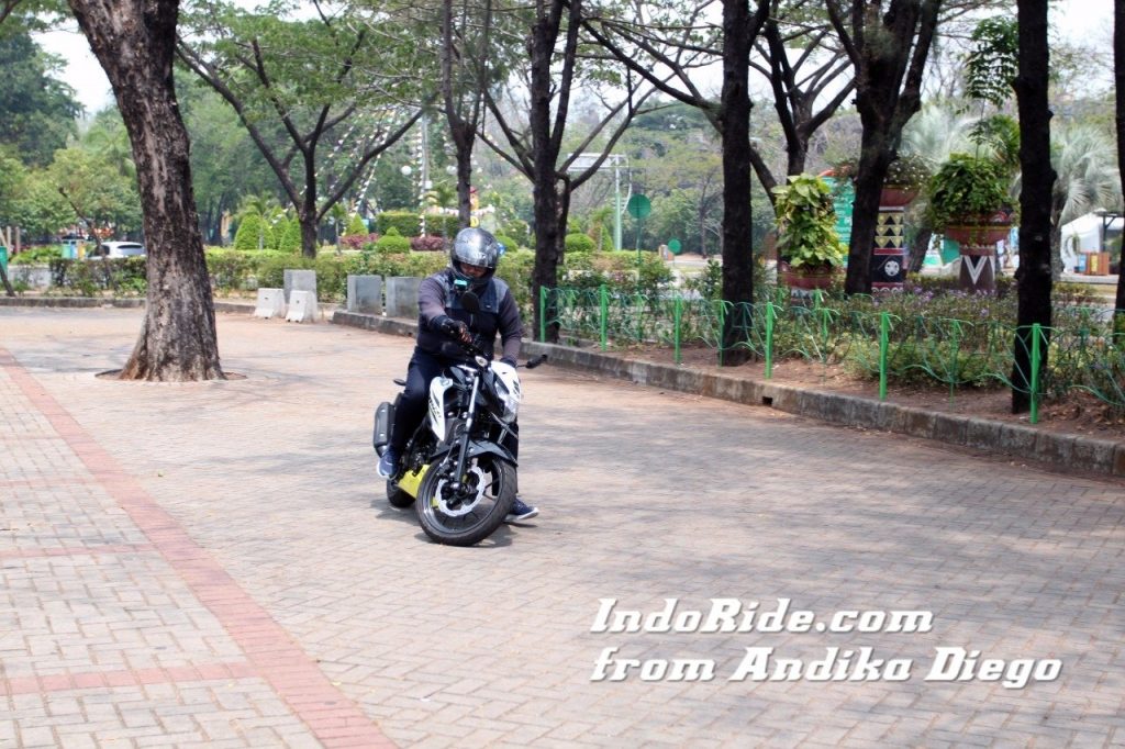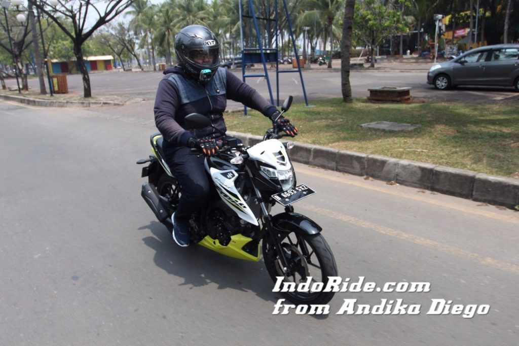 Oke, cusss! kebetulan IndoRide dapet Suzuki GSX150 Bandit warna putih hijau, atau nama jualnya adalah Brilliant White Aura Yellow, yang eye catching dan nyentrik. Pas banget sama jiwa muda IndoRide wkwkkw #halahhh! Langsung cobain naik di atas jok naked bike terbaru dari Suzuki ini. FEELnya bener bener berbeda dibanding naik GSX-S150! Tentu saja jadi lebih nyaman, karena jok terasa lebih lebar dan empuk, posisi stang dan footstep juga sedikit terkoreksi akibat jok yang lebih tebal. Feel in bike nya lebih dapet. Kesan pertama sudah mantap!
