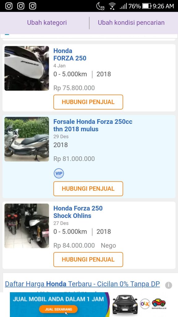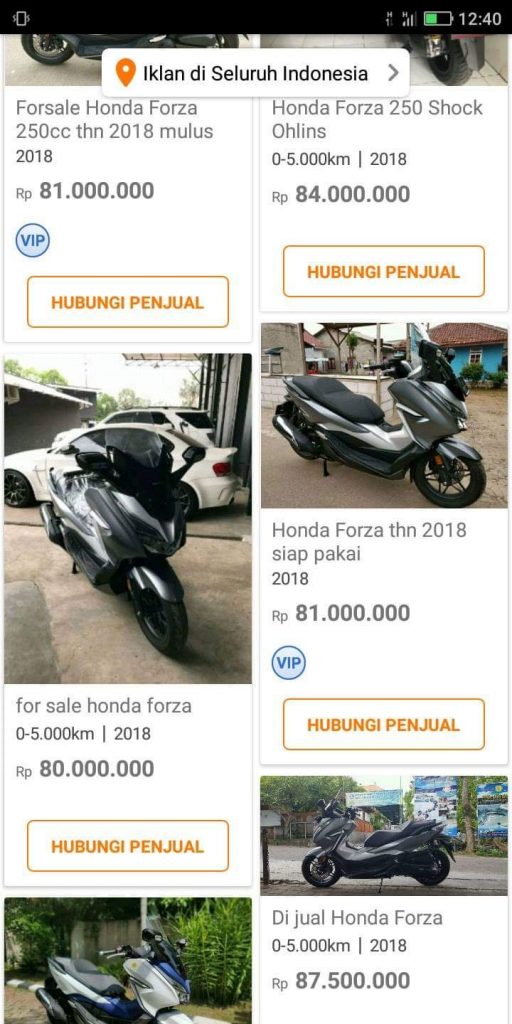 Ternyata, harga yang dipatok oleh para penjual ini lebih tinggi dibanding harga barunya yang dibanderol Rp 76,5 juta. Harga second Forza 250 di situs jual beli OLX berkisar antara 75-80 juta lebih! Tentu menimbulkan pertanyaan nih ya, kok bisa harga motor bekas lebih mahal dari barunya itu sendiri? Saya sempat share perihal ini di instagram saya @indoride, dan banyak yang komentar mempertanyakan hal tersebut.