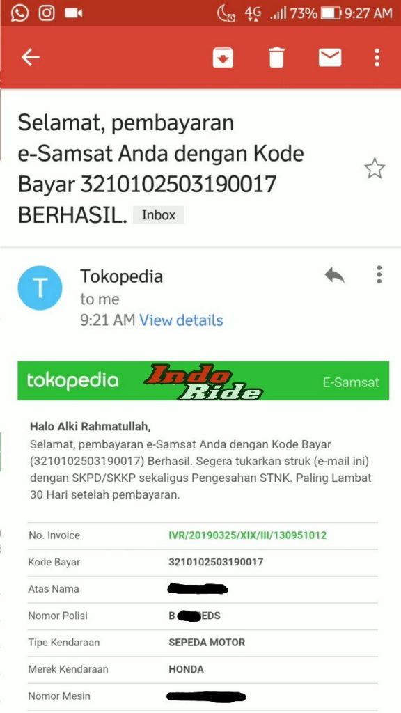 Nahhh, setelah bayar lewat m-banking atau atm, nanti brosist dapat lagi yang namanya Invoice. Invoice ini harus disimpan dan diprint untuk jadi bukti pengesahan STNK di Samsat terdekat. Note : untuk pengesahan memang harus di Samsat lagi, gak bisa langsung di Alfa/Indomaret, bisa di bank BJB juga. Lanjut, brosist tinggal print invoice yang berisi data pembayaran tersebut sebagai bukti sah pembayaran STNK motor. Jangan lupa, langsung tukarkan invoice untuk pengesahan STNK ya, karena paling lambat waktu pengesahan adalah 30 hari setelah pembayaran.