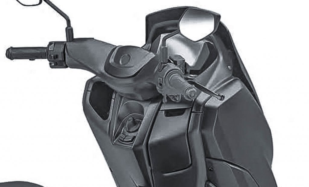 Kita pindah ke area kemudi, dimana stang sudah dilapisi oleh cover stang yang mirip dengan cover stang Xmax. Bentuknya jauh lebih gagah dan berisi dibanding dengan Nmax sekarang yang terlihat lebih sleek. Kesan moge look juga terlihat dari penempatan kunci tipe Keyless alias smart key di bagian tengah layaknya Xmax. Semoga saja, diberi sentuhan warna black piano di Knob keylessnya biar berasa makin mewaah! Terus, kita bisa lihat hadirnya kompartemen tertutup yang diduga sudah ada lubang untuk ngecharge hpnya.. Wuiih!