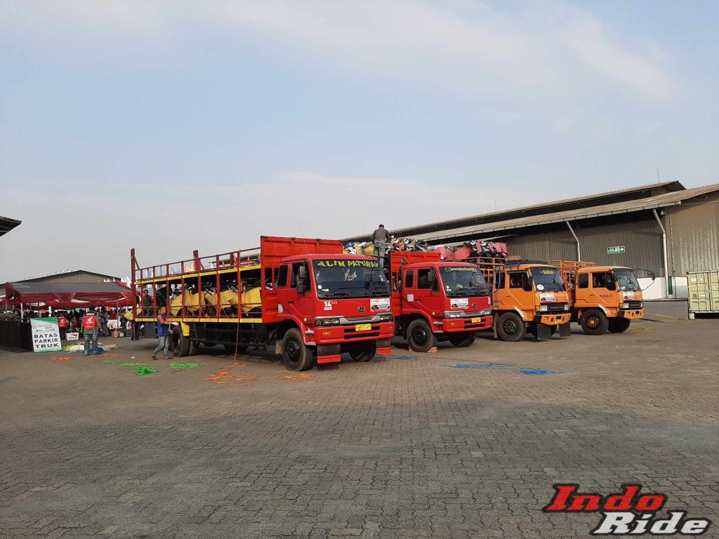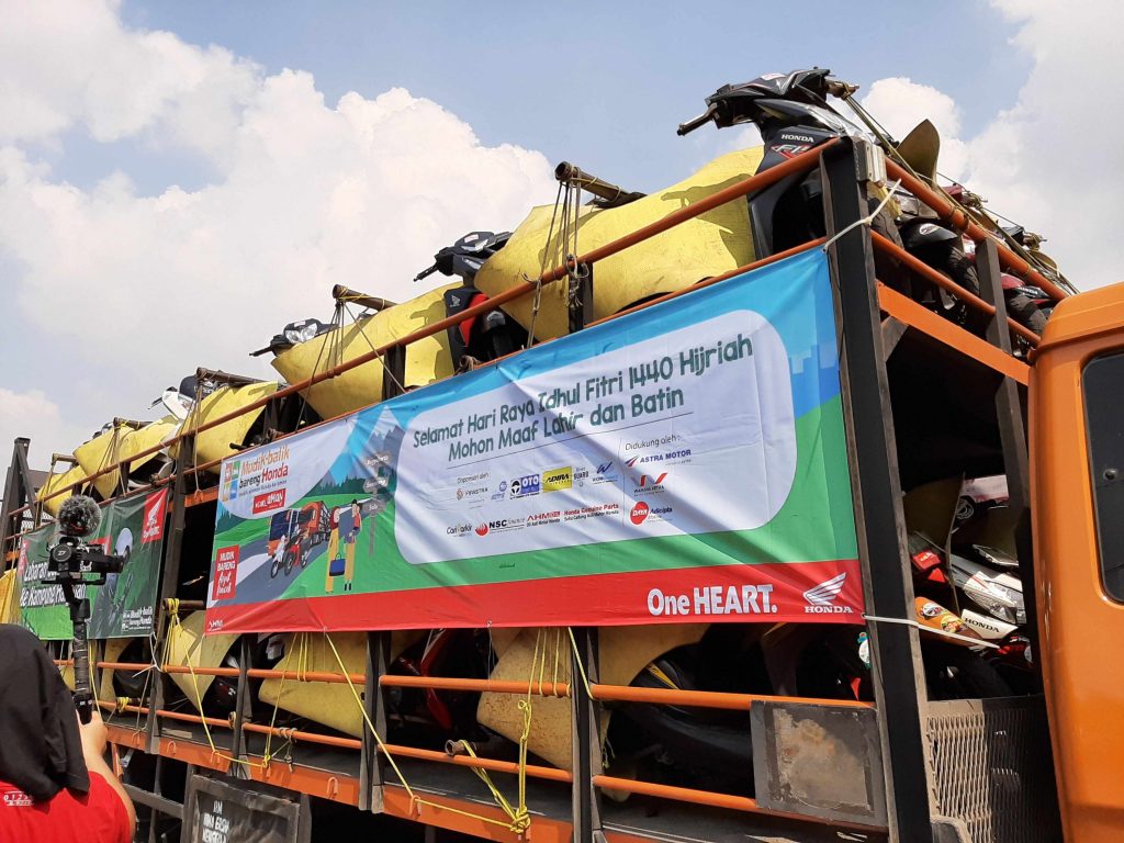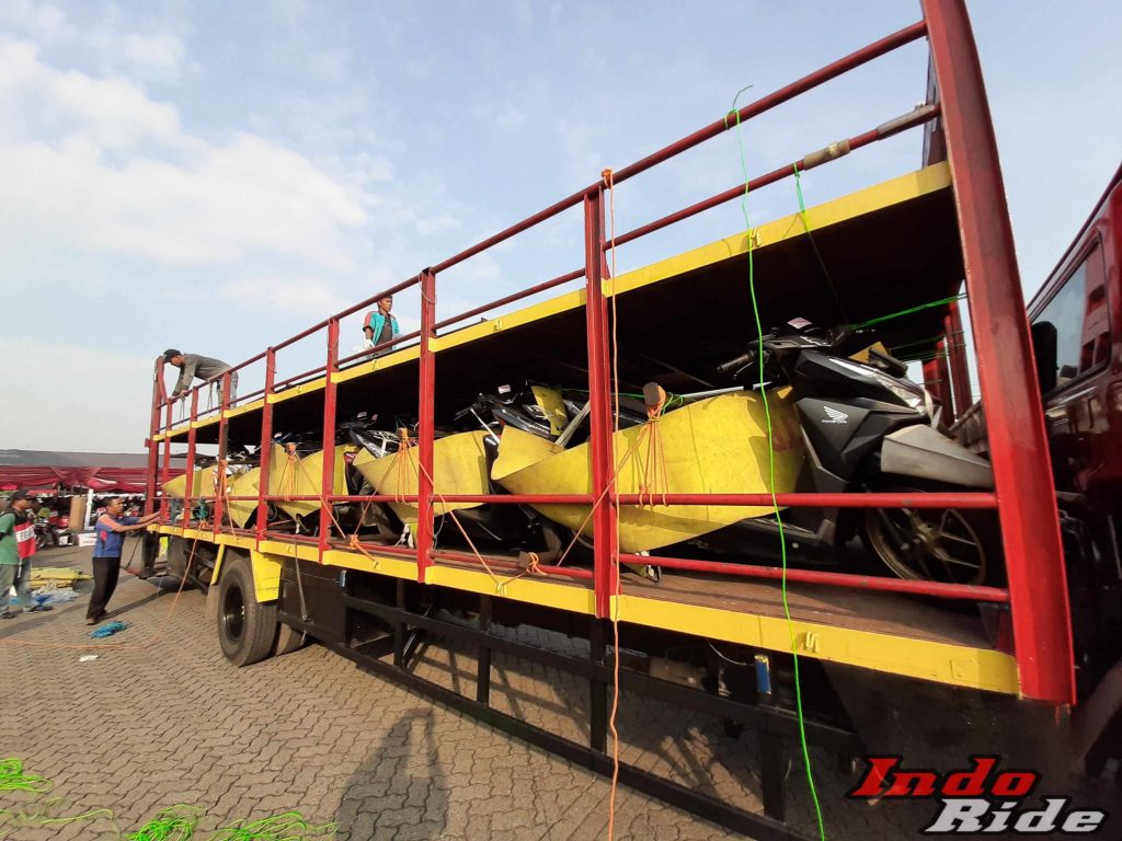 Sebanyak 28 truk yang berisi 1.120 motor Honda para pemudik diberangkatkan menuju Yogyakarta, Semarang dan Solo. Total sebanyak 560 motor diberangkatkan ke Yogyakarta, 320 motor diberangkatkan ke Solo, dan 240 motor diberangkatkan ke Semarang. Sepemantauan saya langsung dari lokasi, pemudik pun mengantar motornya dengan tertib dan rapi, serta menunggu proses motor naik ke truk dengan aman dan nyaman. Karena di lokasi disediakan temapt untuk menunggu sambil motor masuk giliran untuk dipreteli spionnya dan aksesorisnya, serta dikuras bensinnya.