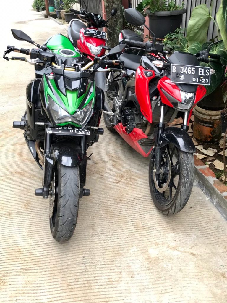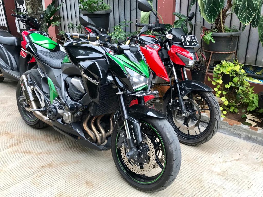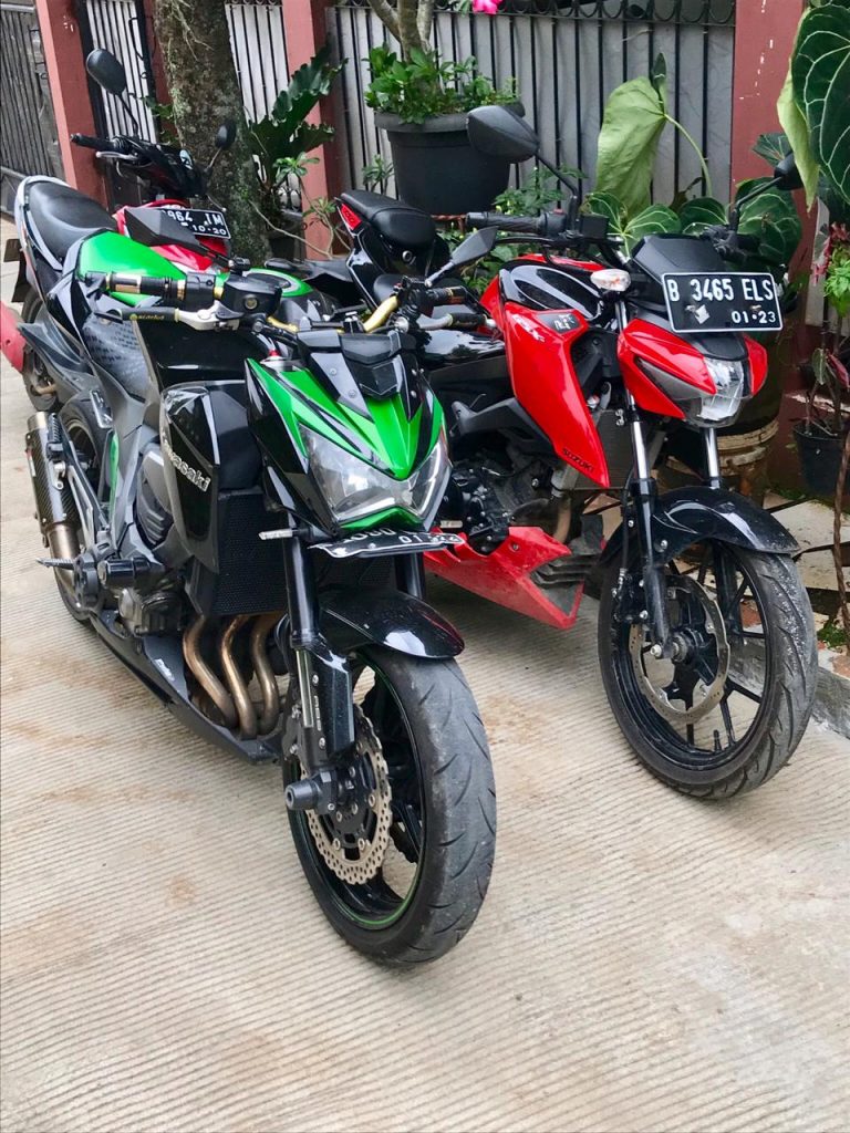Om Ikhsan mengirim gambar dia buah motor yang bersanding bersama. Ini dia Kawasaki Z800 dan Suzuki GSX-S150 yang difoto bersama. Sangat jauh berbeda dimana yang satu adalah moge dengan kubikasi mesin 800cc 4 silinder sedangkan yang satunya adalah 150cc 1 silinder. Dari segi harga pun beda, yang satu hampir 300 juta dan yang satu lagi hanya 25 jutaan. Hmm, sungguh berbeda.