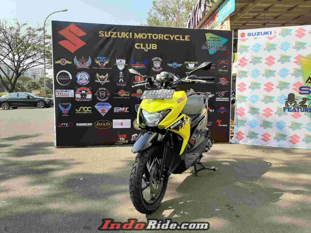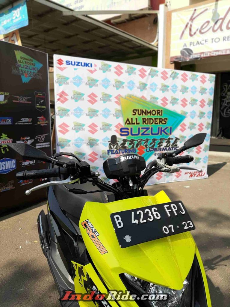 Motor berwarna kuning ini adalah hasil modifikasi dari bro Mamet Rahardi. Untuk detail lainnya memang masih sama dengan Nex II Cross versi standart. Intip saja bagian body yang masih dilabur cat berwarna kuning dan putih, yang detailnya khas Suzuki. Rapi dan penuh glitter! Cakep.. Selain itu, detail lainnya seperti grafis keren ala motor Adventure juga tetap ada.
