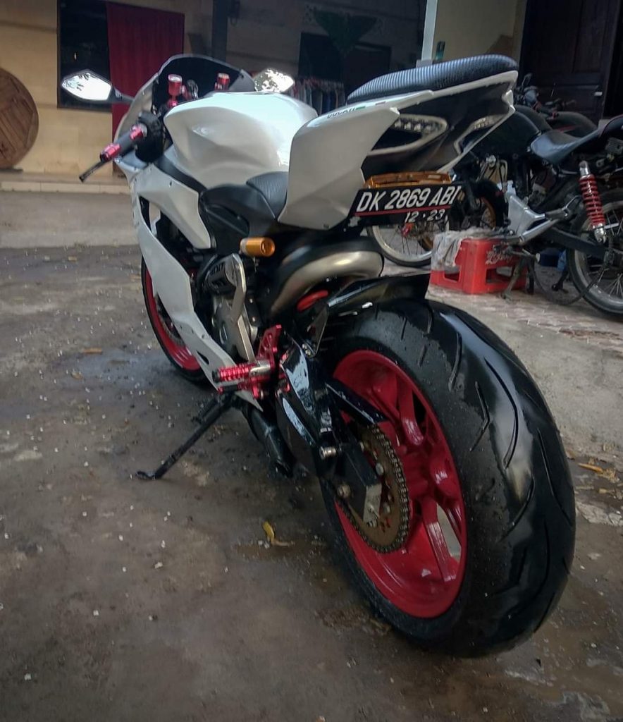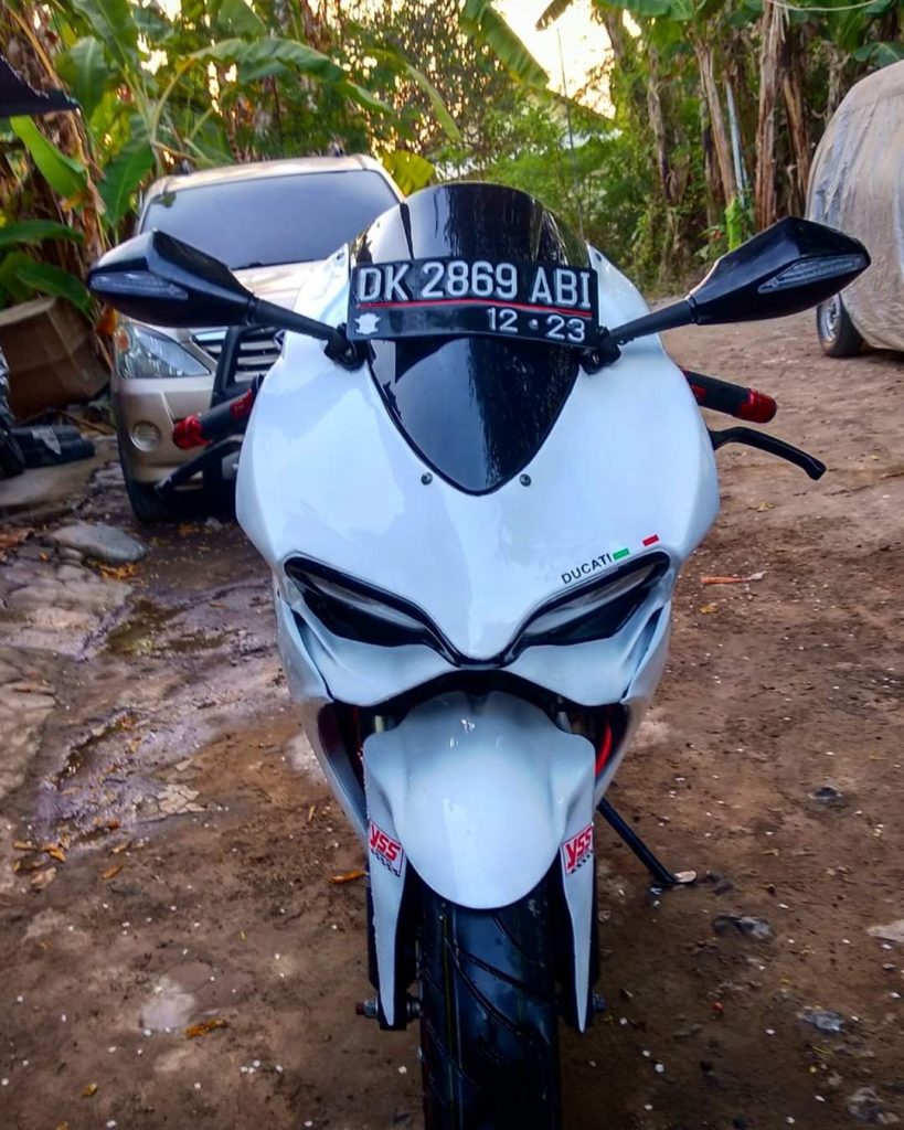 Begitu juga dari segi buntut alias buritan, lekukan-lekukannya terasa identik dengan Ducati Panigale, sportbike asal Italia tersebut. Stoplamp LEDnya juga dibuat semirip mungkin agar lebih identik. Knalpot dengan lekukan besar diatas Swing Arm juga memuat detailnya semakin terasa WAH! Mantep euyy.. Belum lagi kaki-kaki, yang walau ga identik banget (Panigale pakai Mono Swing Arm), tapi udha keliatan bikin berisi dan mirip!