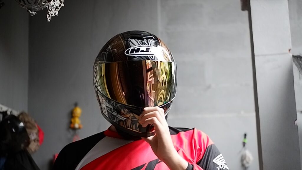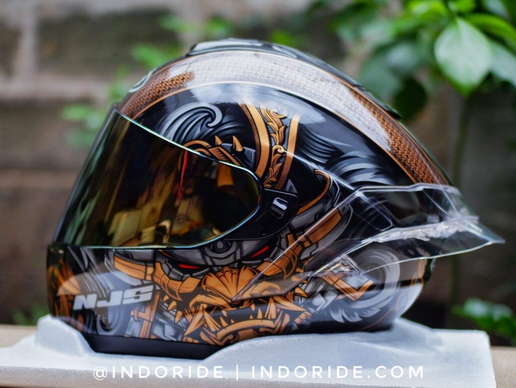 NJS juga memberikan bundling dengan visor iridium Gold yang terlihat pas dan klik banget dengan ZX-1 Samurai. Motif yang didominasi warna Black and Gold emang cocok banget ketika disandingkan dengan visor warna emas. Cakep! Dan kabarnya, buat kalian yang mau beli secara terpisah juga harganya murah banget loh visornya! Gak sampai 200rb, udah dapet visor iridium… hemat bener yak!
